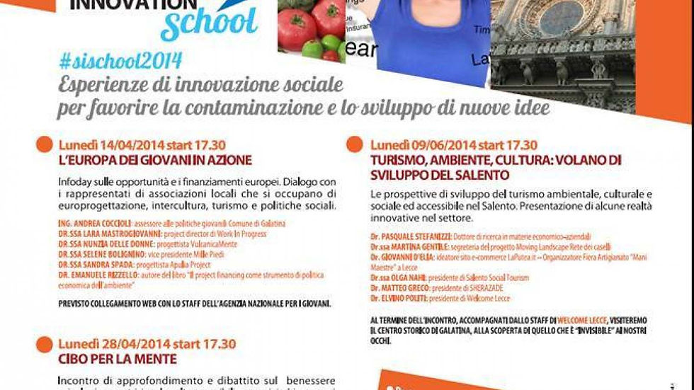 Social Innovation School, esperienze di innovazione sociale 14 aprile 2014 Per favorire la contaminazione e lo sviluppo di nuove idee, quattro incontri con diversi esperti su opportunità e finanziamenti europei, benessere psicologico e nutrizionale, attori di rischio provocati dallo stress del proprio lavoro, prospettive di sviluppo del turismo ambientale, culturale e sociale ed accessibile nel Salento.